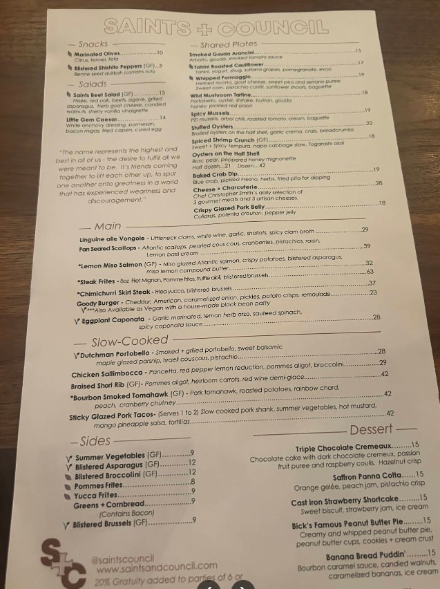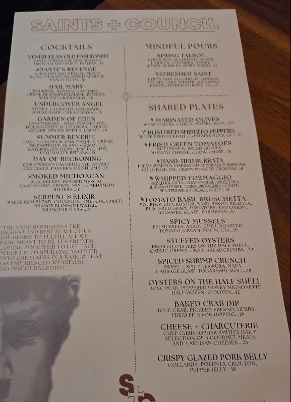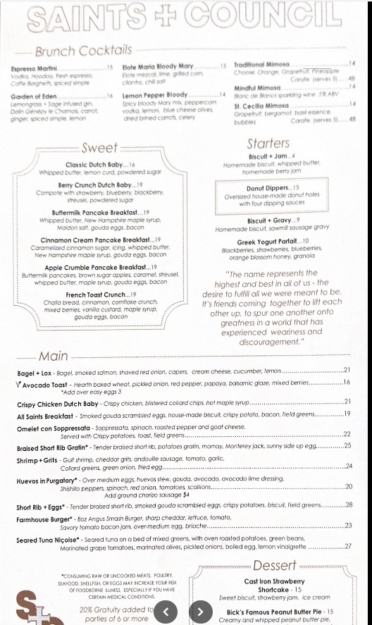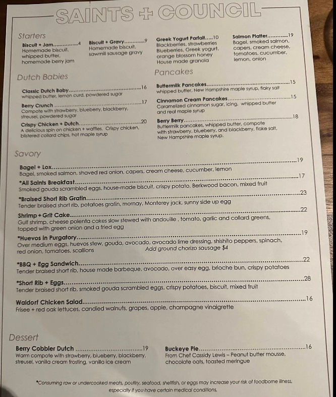 My girlfriend and I had an amazing experience at Saints + Council! From the moment we walked in, the vibe was warm and inviting. We were lucky to have Mark as our server—his service was absolutely top notch. He made us feel welcome and took great care of us throughout the meal. Now the food… unbelievable! We shared the cinnamon cream pancakes, huevos in purgatory, and the braised short rib gratin—each dish was bursting with flavor and beautifully presented. Every bite felt like a treat, and we left already planning our next visit. Highly recommend this spot if you're looking for a delicious brunch and top-tier service in a great atmosphere!