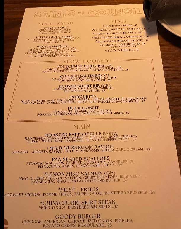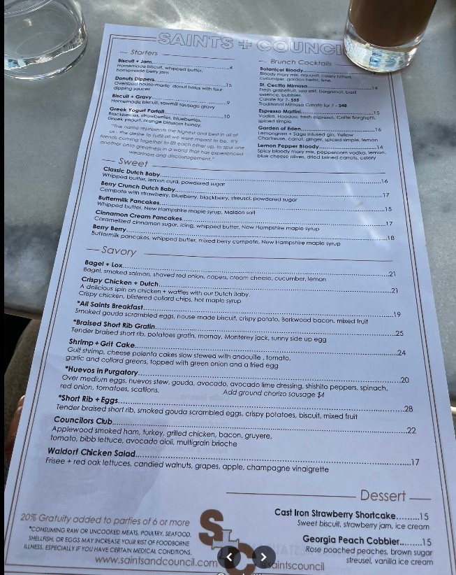 If you’re searching for the Saints and Council Restaurant menu, you’re in the right place. Nestled in the heart of Colony Square, Atlanta, Saints + Council blends comfort and creativity with a modern American dining experience. From brunch classics and hearty entrées to freshly crafted cocktails and desserts, every dish is designed for connection and community. Whether you’re planning a relaxed dine-in visit, quick takeaway, or delivery, our menu is packed with flavorful options for every appetite. Dive in below and explore what makes Saints and Council one of Atlanta’s most-loved dining destinations.